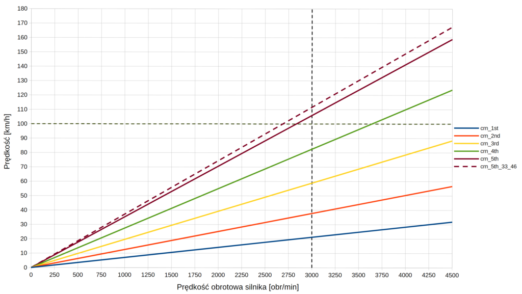 Dzięki zmianie przełożenia z 0,756 na 0,717 uzyskujemy wzrost prędkości o około 10km/h przy 3000obr/min – z 105km/h do około 110-115km/h (patrz wykres poniżej), ciągle zachowując odpowiednie przyśpieszenie na tym biegu / moment obrotowy pozwalający na pokonanie wzniesień czy dużych podmuchów wiatru przy prędkościach powyżej 100km/h. Przy takiej modyfikacji warto również wziąć pod uwagę czy głównie poruszamy się załadowanym czy pustym pojazdem.